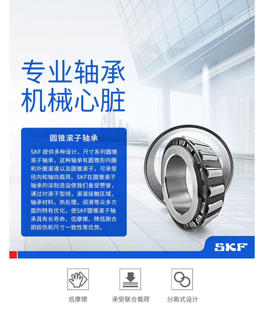 SKF圆锥滚子轴承,可以分离,由内圈与滚子、保持架一起组成的组件和外圈可以分别安装。产品特性:滚子和滚道接触处修正的接触线可以减少应力集中。SKF圆锥滚子轴承可以承受大的径向载荷和轴向载荷。由于圆锥滚子轴承只能传递单向轴向载荷,因此,为传递相反方向的轴向载荷就需要另一个与之对称安装的圆锥滚子轴承。